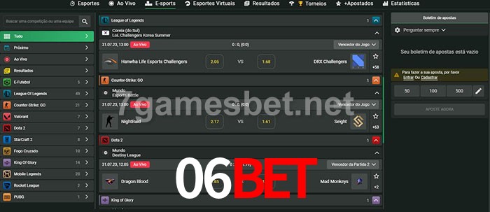 O 06Bet oferece uma grande seleção de opções de apostas em e-sports com probabilidades competitivas